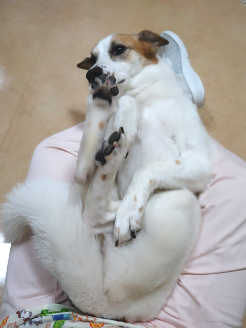 ルーサーも同じように足の間にハマって爪切りと足裏の毛刈りからスタート!