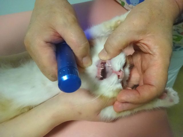 眼の状態や、耳、毛並、皮膚などをチェックして、次は歯を見ていきます。