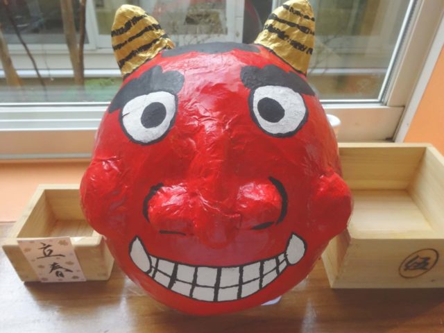 そして節分の飾りつけは、受付のところに大きな鬼の仮面が、、、!!
