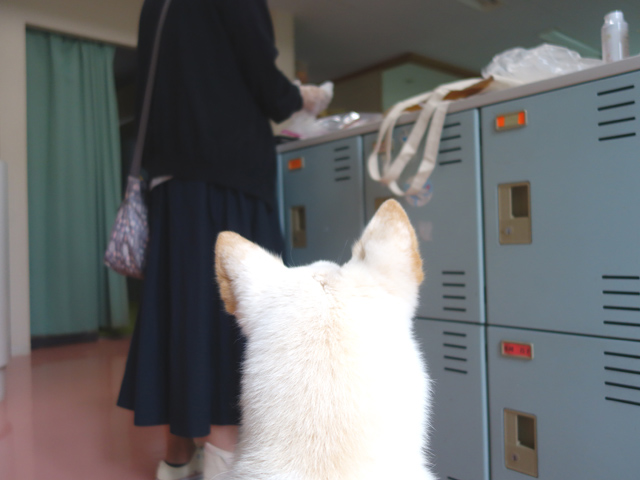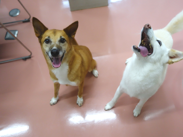しばらくして事務所に行くと、だいぶ落ち着いてしっかりとお座りしていい子にしているシロちゃん