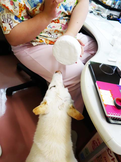 お昼の時間、いつもよりテンション高めな病院犬のシロちゃん ▼・ᴥ・▼