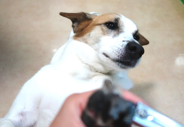 爪切りが苦手なルーサーは、視線を遠くへ飛ばして現実逃避中