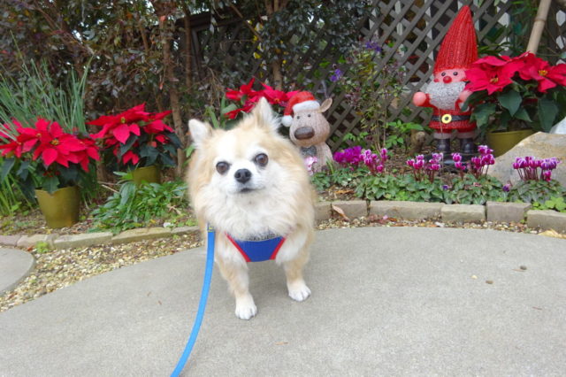 2人とも少し寒かったですが、お外にあるポインセチアとサンタ、トナカイの置き物とパシャリ!